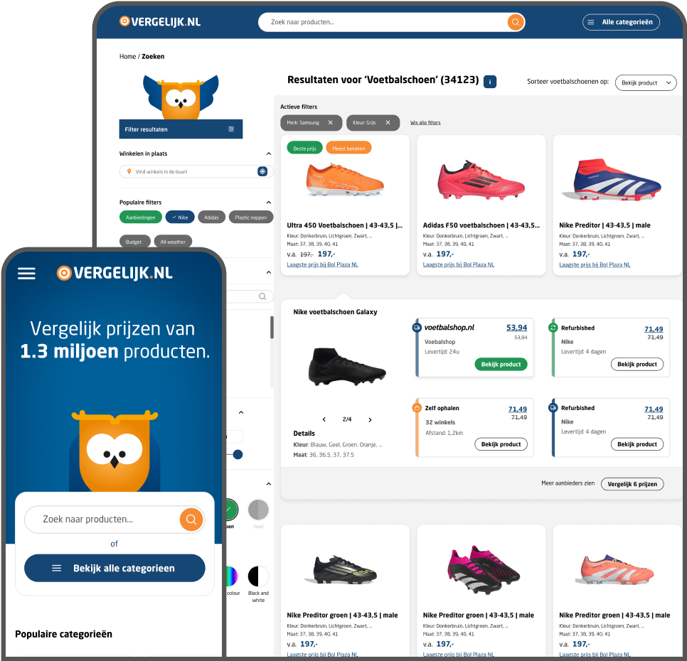 Op onze website kunnen consumenten, in een van onze honderden categorieën: producten zoeken, filteren en vergelijken van diverse winkels.